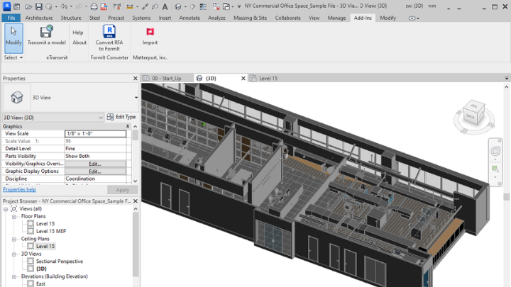 Alongside Matterport BIM Files, we offer an Autodesk® Revit plugin that enables you to import BIM files and point cloud formats straight from your Matterport account without needing additional file conversion. The Matterport Revit plugin is available for free download in the Autodesk App Store and is essential to streamlining Matterport workflows.
